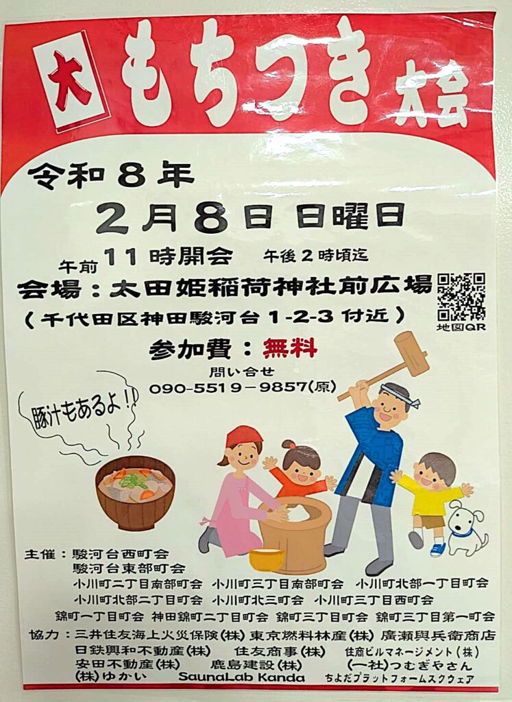 ホーム神保町出張所 【2月8日(日)】太田姫稲荷神社前広場でもちつき大会開催! 2026年2月5日 SHARE ポスト シェア はてブ LINE 2月8日(日)11 時~太田姫稲荷神社前広場で大もちつき大会が開催されます!豚汁や焼き鳥も振る舞われるとの情報が…ぜひ足を運んでみてはいかがでしょうか!